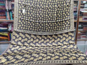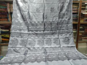 Authentic Slate Black Bishnupuri Pure Silk Saree with Elegant Block Print Motifs