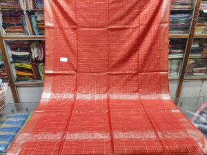 Contemporary Crimson Red Bamboo Silk Saree with Silver Zari Checks & Border