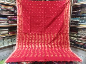 Vibrant Crimson Red Soft Khadi Pure Cotton Saree with Golden-Beige Floral Motifs