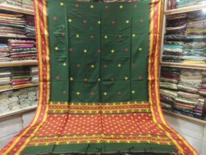 Forest Green Soft Khadi Cotton Saree with Festive Red & Yellow Woven Buttas