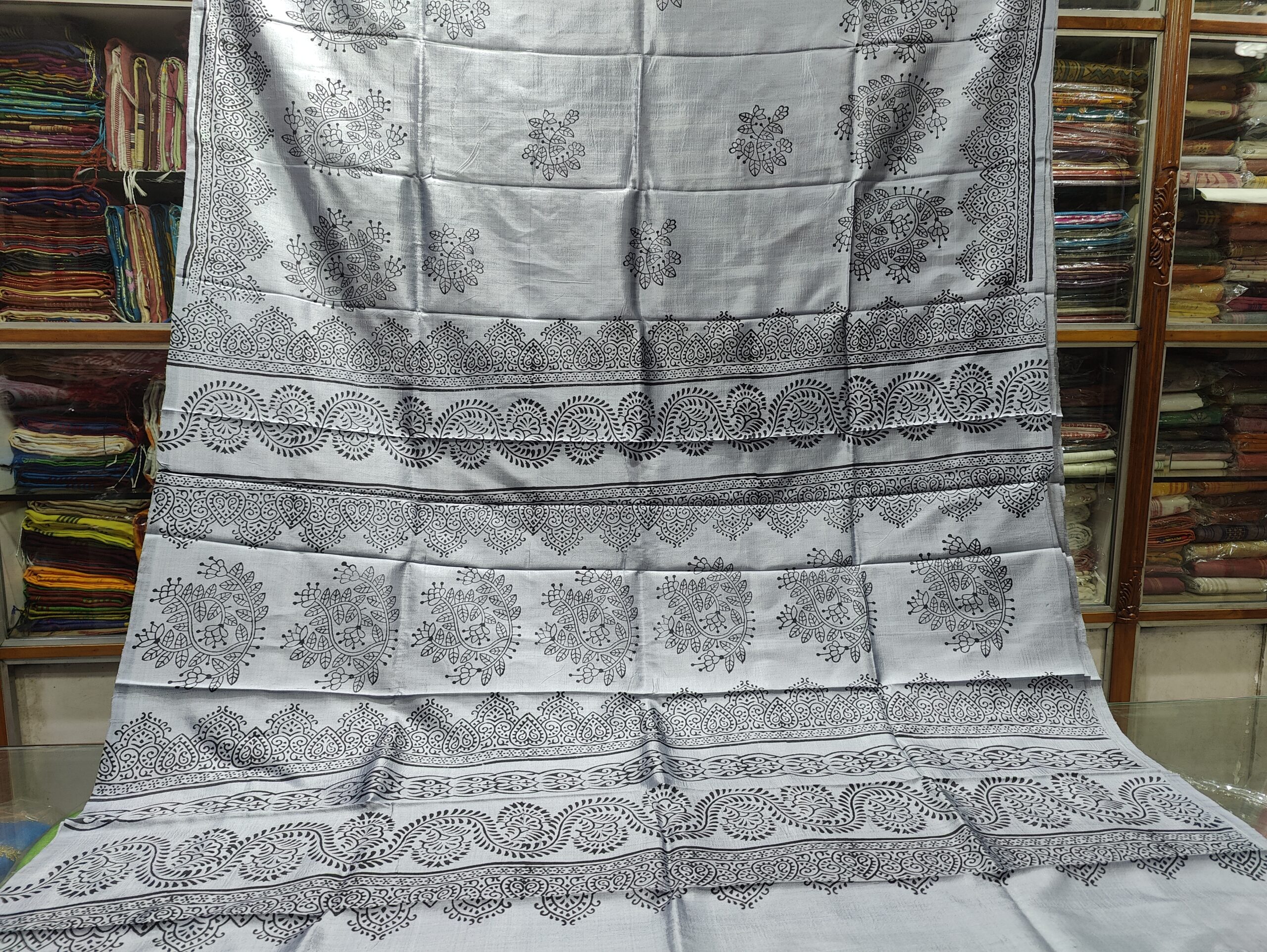 Authentic Slate Black Bishnupuri Pure Silk Saree with Elegant Block Print Motifs