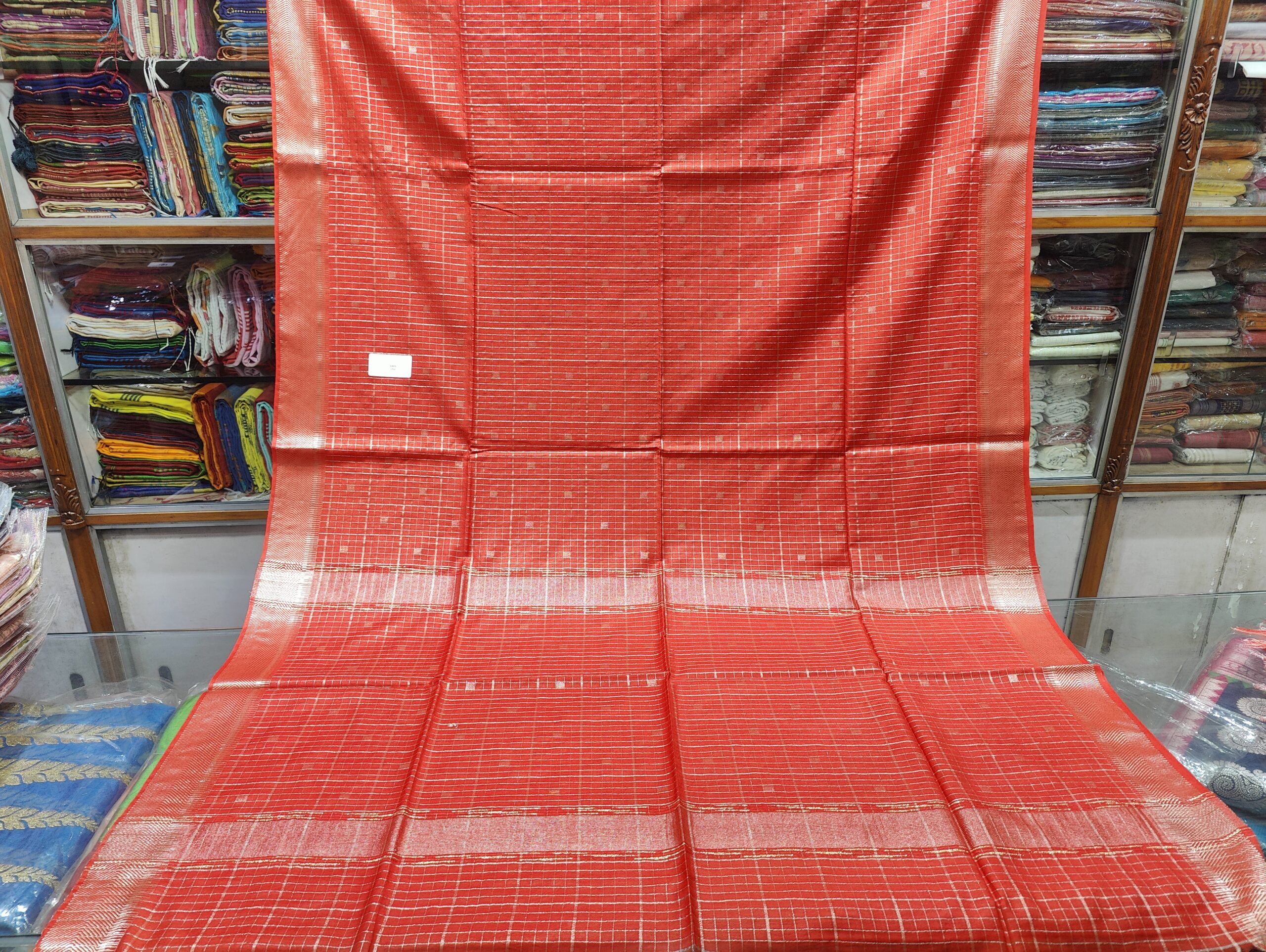 Contemporary Crimson Red Bamboo Silk Saree with Silver Zari Checks & Border