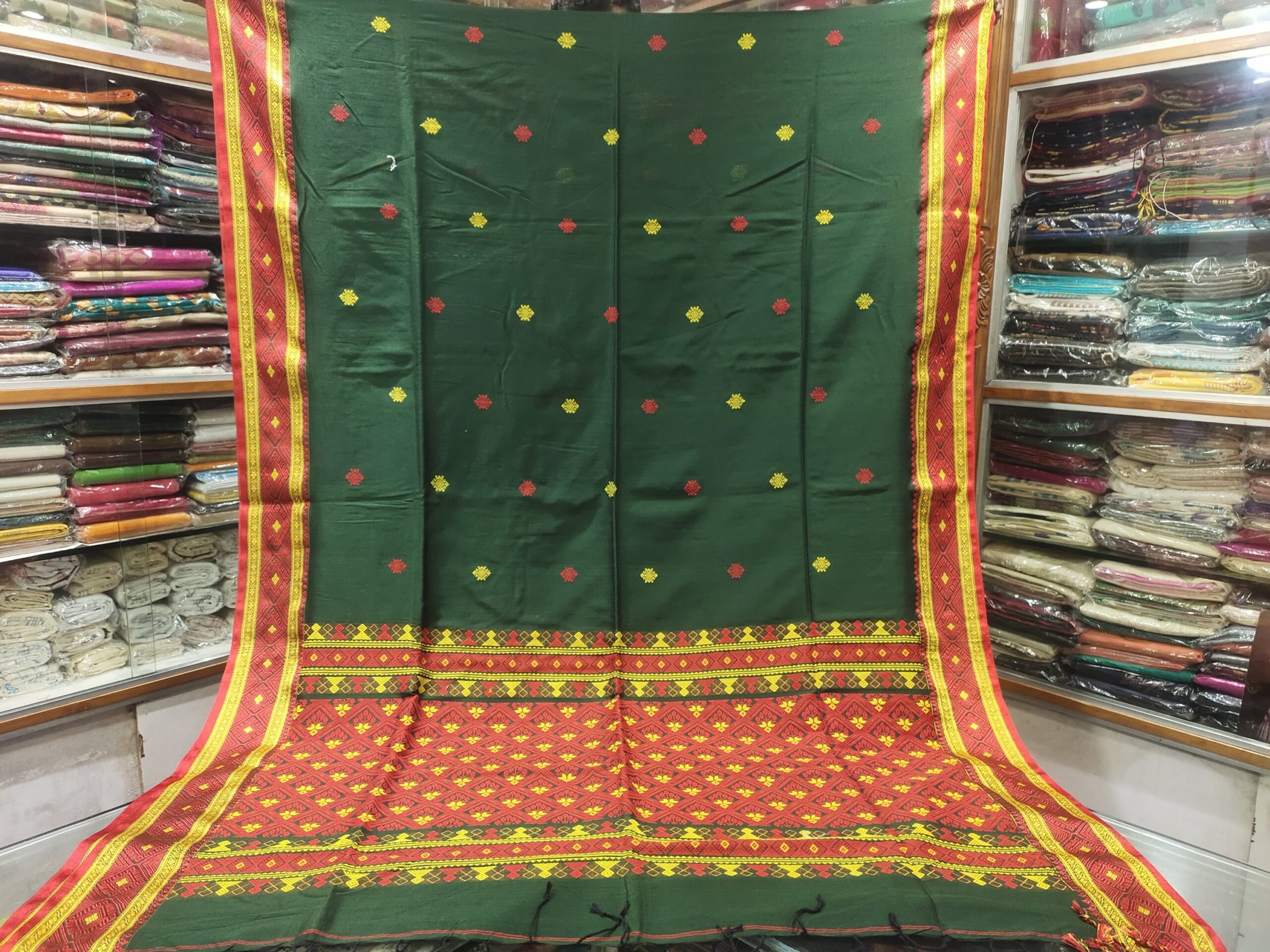 Make a bold statement with this stunning Crimson Red Soft Khadi Saree, a signature piece from the Bengal Saree Museum. This saree is a celebration of classic color and intricate handloom artistry. The entire length is adorned with elegant, golden-beige leaf and vine motifs (buttas), culminating in a dense, breathtaking pallu that showcases rhythmic floral patterns. Crafted from 100% pure cotton, it offers a royal look without compromising on the comfort required for the Indian climate.